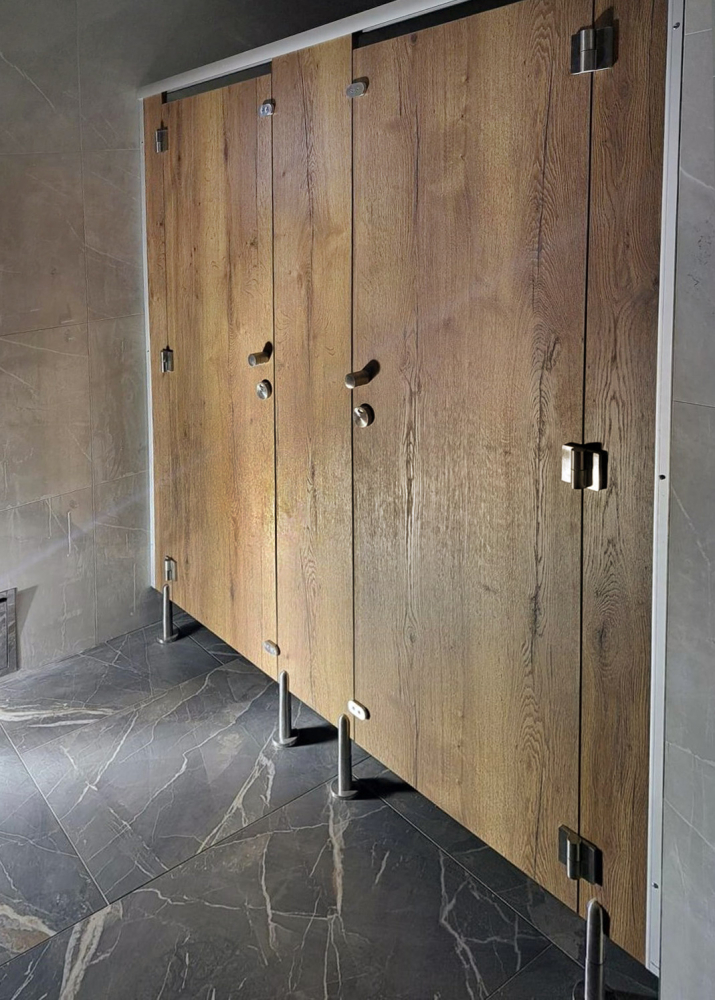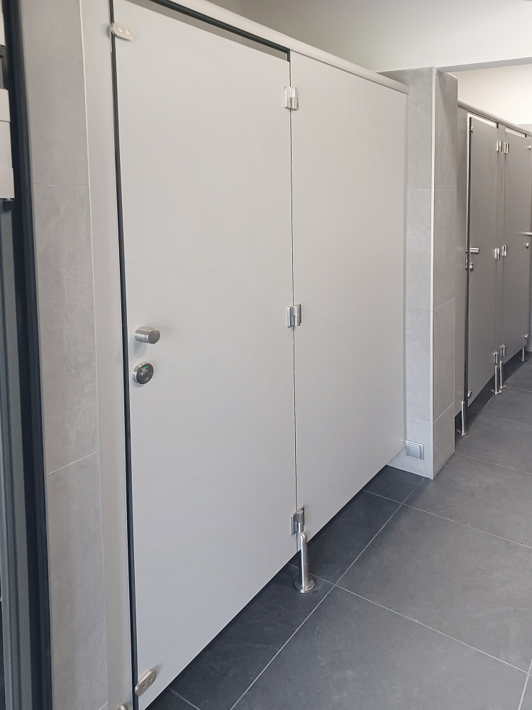 Příčky jsou vyrobeny z voděodolného laminátu HPL o tloušťce 12 mm, který je samozřejmě hygienicky nezávadný. Tento materiál je známý nejenom svou odolností vůči vlhkosti a vodě, ale také odolností vůči nárazu, tlaku, chemikáliím a poškrábání, což zajišťuje dlouhou životnost kabin a minimalizuje potřebu údržby.