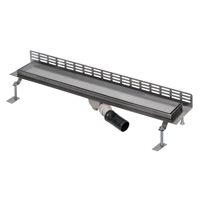 SLKN 15 - obj. č. 69150 - žlábek, nerezová vanička (určená pro nalepení dlažby, max. hloubka dlažby 12 mm - pro vyšší dlažbu je možno dodat koupelnový žlábek na zakázku), sifon se zápachovou uzávěrou, stavitelné šrouby M10 (4 ks), háček pro vyjmutí vaničky, hydroizolační páska, montážní sada