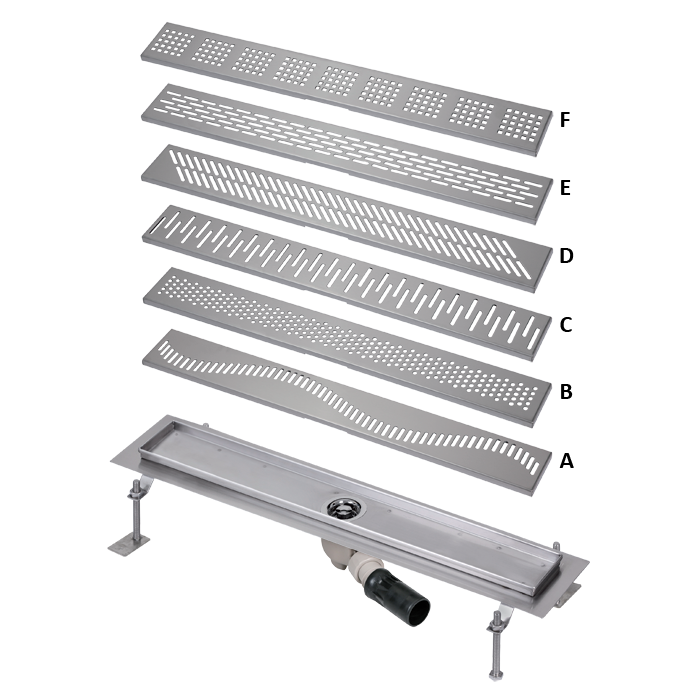 žlábek, mřížka, povrch lesklý, sifon se zápachovou uzávěrou, stavitelné šrouby 4 x M10, háček pro vyjmutí mřížky, hydroizolační páska, montážní sada