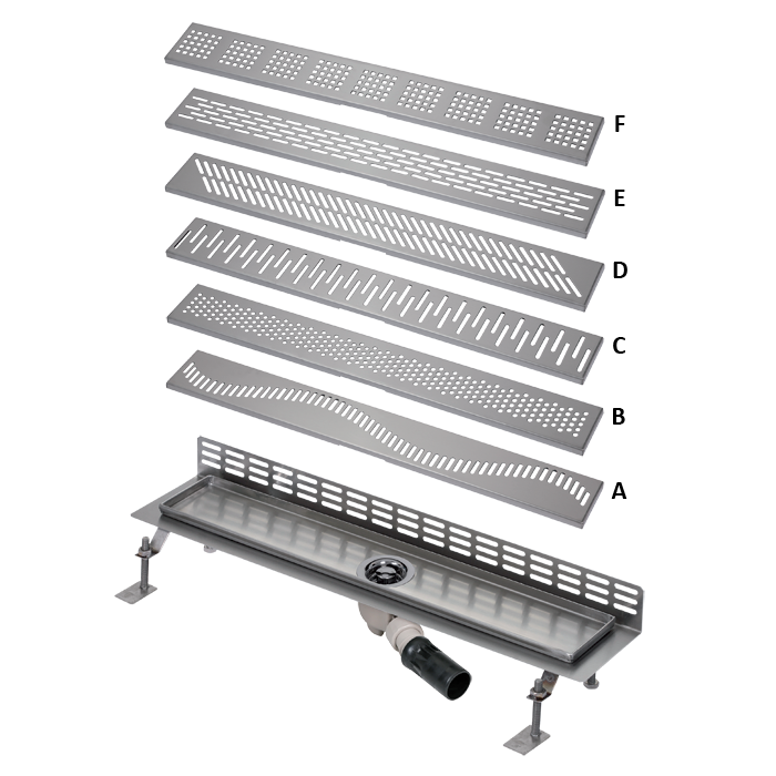 žlábek, mřížka, povrch lesklý, sifon se zápachovou uzávěrou, stavitelné šrouby 4 x M10, háček pro vyjmutí mřížky, hydroizolační páska, montážní sada