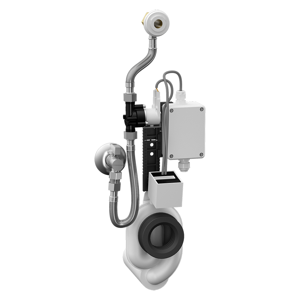 SLP 07Z - obj. č. 01071 - radarový splachovač včetně modulu Bluetooth na montážní liště, elektromagnetický ventil, propojovací hadice, rohový ventil s filtrem a zpětnou klapkou, vtoková armatura s těsněním, sifon, montážní šablona, napájecí zdroj
