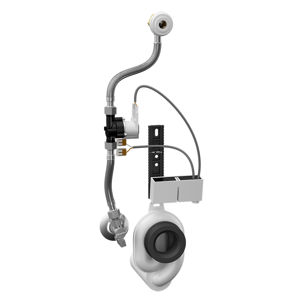 SLP 36RS - obj. č. 11365 - radarový splachovač včetně modulu Bluetooth na montážní liště, elektromagnetický ventil, propojovací hadice, rohový ventil s filtrem a zpětnou klapkou, vtoková armatura s těsněním, sifon, montážní šablona