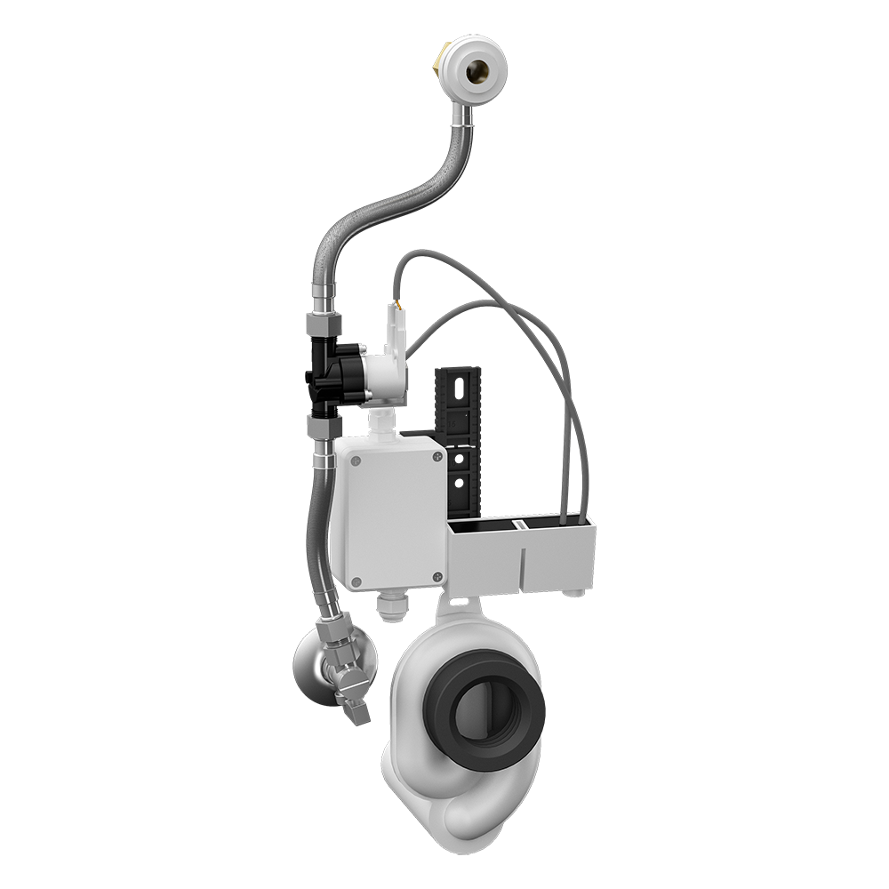 SLP 36RZ - obj. č. 01365 - radarový splachovač včetně modulu Bluetooth na montážní liště, elektromagnetický ventil, propojovací hadice, rohový ventil s filtrem a zpětnou klapkou, vtoková armatura s těsněním, sifon, montážní šablona, napájecí zdroj