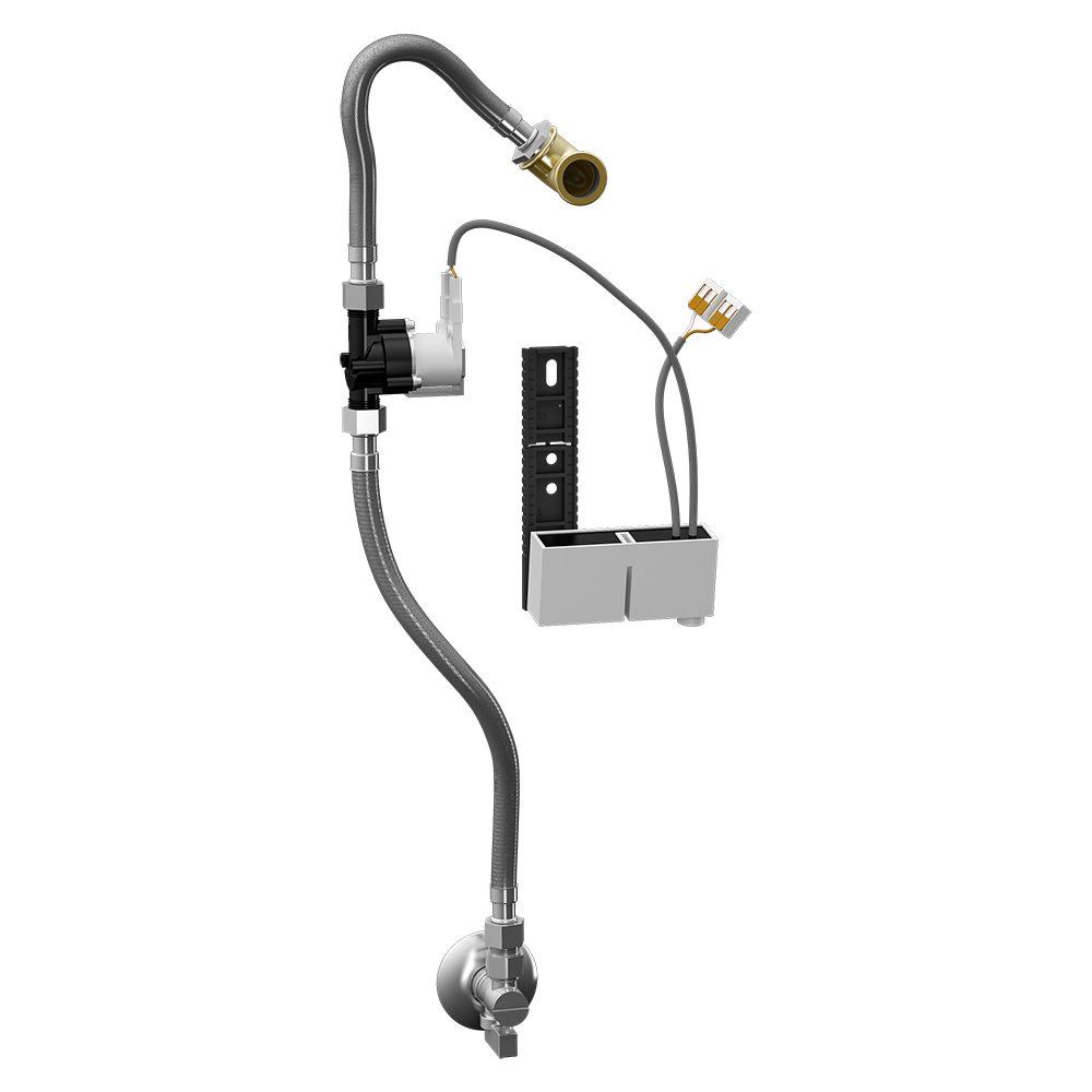 SLP 54RS - obj. č. 11545 - radarový splachovač včetně modulu Bluetooth na montážní liště, elektromagnetický ventil, propojovací hadice, rohový ventil s filtrem a zpětnou klapkou, vtoková armatura s těsněním, montážní šablona