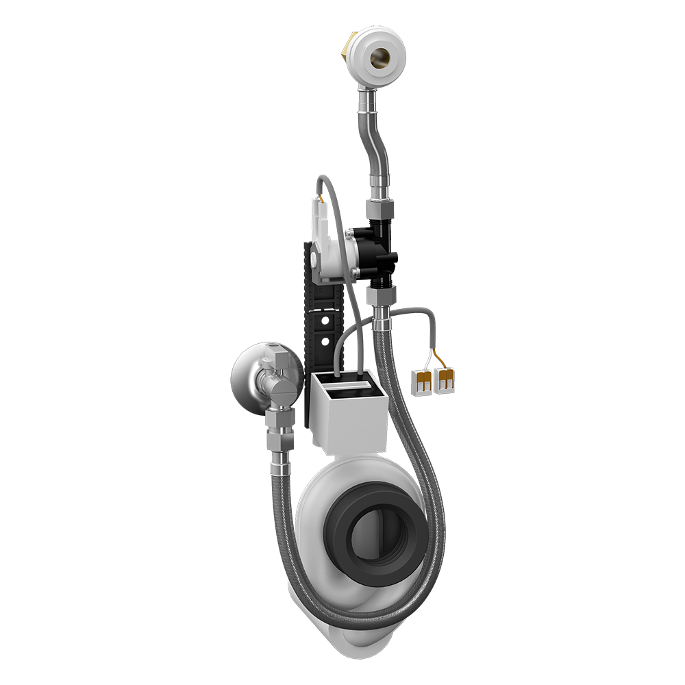 SLP 70RS - obj. č. 11705 - radarový splachovač včetně modulu Bluetooth na montážní liště, elektromagnetický ventil, silikonová zátka (2 ks), rohový ventil s filtrem a zpětnou klapkou, vtoková armatura s těsněním, sifon, montážní šablona