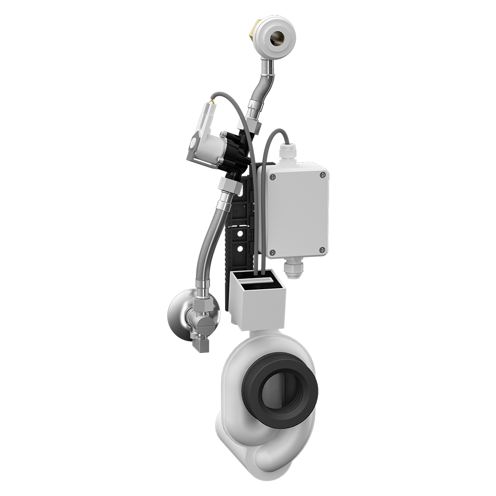 SLP 71RZ - obj. č. 11716 - radarový splachovač včetně modulu Bluetooth na montážní liště, elektromagnetický ventil, silikonová zátka (1 ks), rohový ventil s filtrem a zpětnou klapkou, vtoková armatura s těsněním, sifon, montážní šablona, napájecí zdroj
