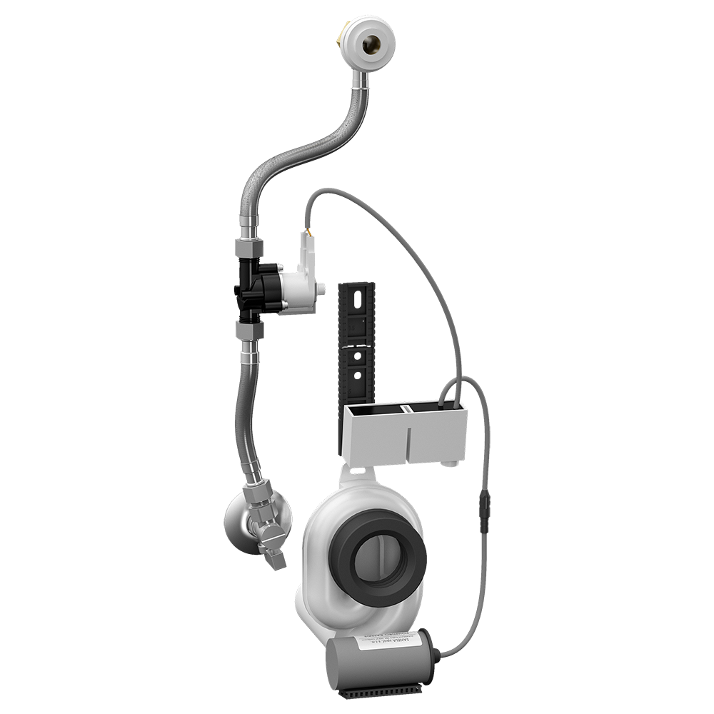 SLP 92B - obj. č. 01922 - radarový splachovač včetně modulu Bluetooth na montážní liště, elektromagnetický ventil, propojovací hadice, rohový ventil s filtrem a zpětnou klapkou, vtoková armatura s těsněním, sifon, montážní šablona, 4 ks AA alkalických baterií 1,5 V, 2700 mAh s pouzdrem