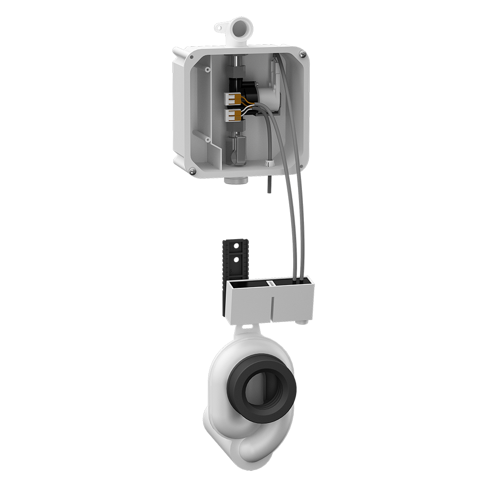SLP 99Z - obj. č. 21994 - radarový splachovač včetně modulu Bluetooth na montážní liště, montážní box s výtokovou armaturou, těsněním a elektromagnetickým ventilem, sifon, napájecí zdroj