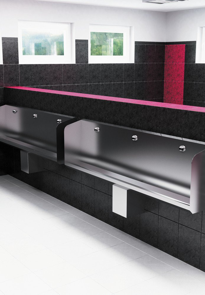 - závěsné nerezové pisoárové žlaby s integrovanou splachovací hlavicí