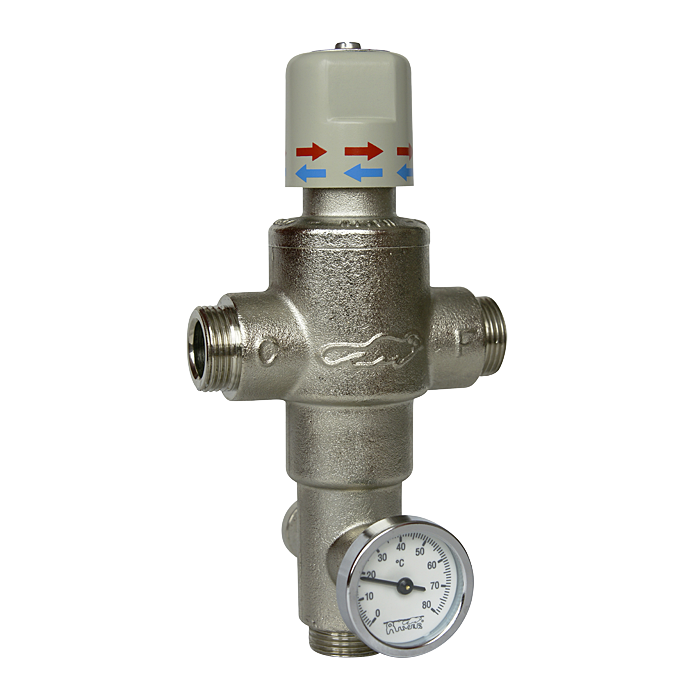 SLT 07A - obj. č. 09071 - termostatický ventil s pojistkou, 3/4“, vestavěný teploměr, bezpečnostní systém proti opaření