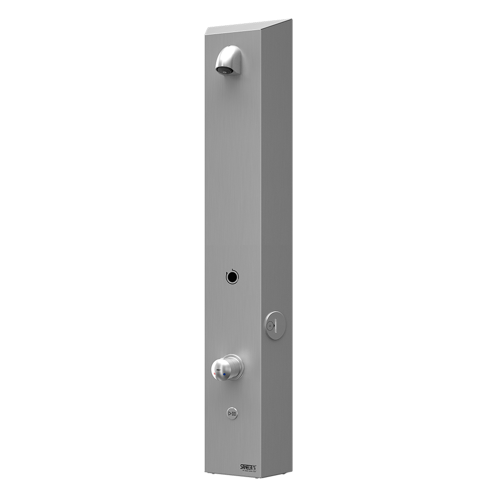 SLZA 29 - obj. č. 89290 - sprchový panel s elektronikou, sprchová hlavice s nastavením úhlu výtoku, elektromagnetický ventil (1 ks), směšovací baterie, propojovací hadice, rohový ventil s filtrem a zpětnou klapkou (2 ks)