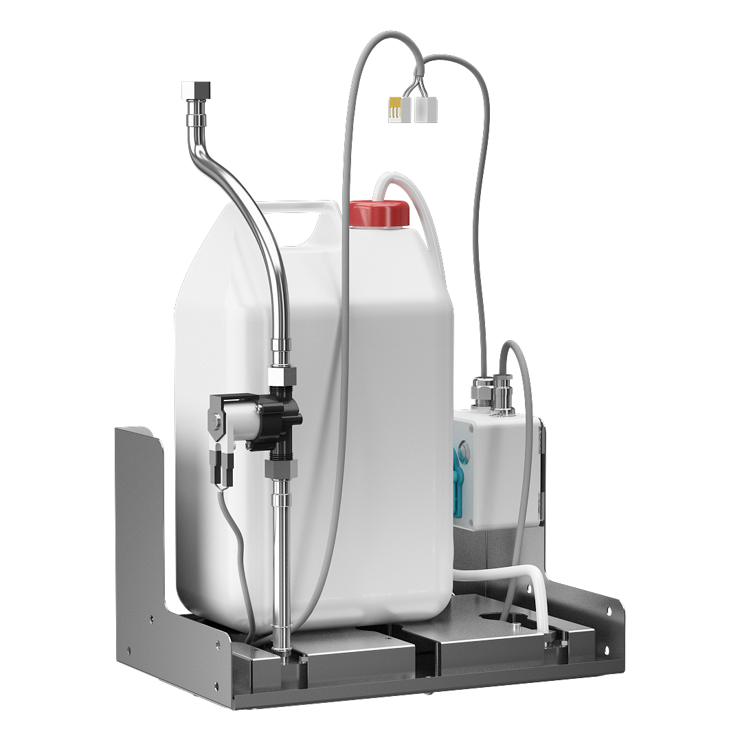 SLZN 84F - obj. č. 85842 - nerezový montážní držák s výtokem, dávkovačem mýdla a elektronikou, elektromagnetický ventil, propojovací hadice, rohový ventil s fi ltrem, přívodní hadičky, čerpadlo na mýdlo, kanystr 5 l